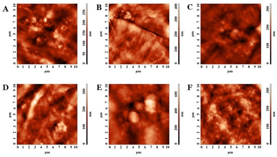 The 2D AFM images collected on (A) PVA72000_PEBSA25/75_Thy-αTcp, (B), PVA72000_PEBSA50/50_Thy-αTcp, (C) PVA72000_PEBSA75/25_Thy-αTcp, (D) PVA145000_PEBSA25/75_Thy-αTcp, (E) PVA145000_PEBSA50/50_Thy-αTcp, and (F) PVA145000_PEBSA75/25_Thy-αTcp.