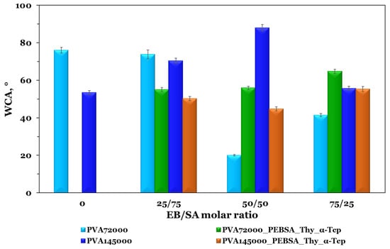 The wettability variation of PVA_PEBSA blends is different and depends on the PVA molecular weight. As already pointed out in a previous study [27], EB governs the hydrophobic character of the PEBSA copolymer. For the PVA_PEBSA samples, the WCA does not vary proportionally with the PEBSA ratio, which indicates that the wettability is highly influenced by the supramolecular arrangement of the polymeric constituents in the blends. The PVA145000_PEBSA25/75 sample has the largest CA of ~88°, placing the sample at the upper limit of the hydrophilic domain (WCA of 90°), suggesting a slight hydrophobic character, whilst the PVA72000_PEBSA50/50 presents a lower contact angle of 20.1°, attributed to a strong hydrophilic surface (see Figure 4). The samples containing PVA with low molecular weight, show a much wider variation in the wettability, while in the case of PVA145000-based systems, the variation is narrow. The PVA145000_PEBSA75/25 sample has the lowest contact angle value, while the PVA145000_PEBSA50/50 system registers the highest score, at the upper limit of the hydrophilic domain near the hydrophobic one. This suggests that the PVA low molecular weight presents a wider range of possible interactions with PEBSA.