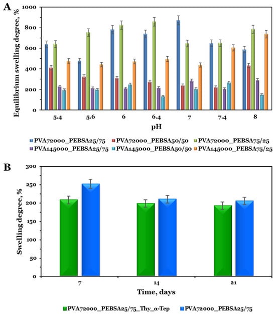 Hydrogel dressings require an adequate fluid assimilation capacity in order to absorb excessive exudates, thus reducing the risk of infection as well as providing a moist local environment [29]. To evaluate the response of the cryogels based on PVA and PEBSA copolymacrolactone in phosphate buffers in relation with the environmental pH variation, the samples were immersed in PBS solutions at 37 °C at different pH values (5.4, 5.6, 6, 6.4, 7, 7.4, and 8, 0.01 M) (Figure 5A). Taking into account the pH fluctuations as the wound progresses toward healing [30], a range of 5.4–8.0 was selected for the swelling studies. Moreover, in order to anticipate the in vivo bioactivity of the cryogel scaffolds, the swelling behavior study of the PVA72000_PEBSA25/75_Thy_α-Tcp and PVA72000_PEBSA25/75 systems was performed in SBF solution, a fluid that mimics the inorganic composition of blood plasma [31] (Figure 5B).