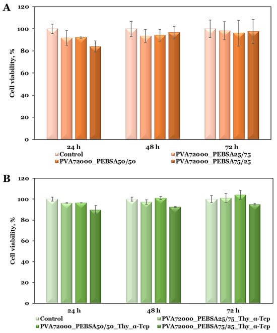 Biocompatibility is the fundamental necessity for a material intended to be used in direct contact with skin tissue [34]. Cell viability represents the initial assessment to analyze cellular mitochondrial function upon interaction with new materials [35]. In this regard, the MTT assay was used to evaluate the cytotoxicity of the PVA72000_PEBSA and PVA72000/PEBSA_Thy_α-Tcp systems on BALB/3T3 fibroblasts according to international standards (ISO 10993-5: 2009) [36]. The MTT results (Figure 6A) proved the cytocompatibility of the PVA72000_PEBSA scaffolds with nearly 90% cell viability after 72 h of incubation. The sample containing the highest amount of SA comonomer (PVA72000_PEBSA25/75) exhibited the most notable results as cell viability increased over time, from 92% at 24 h to 98% at 72 h compared to the control group. As observed from Figure 6B, the interaction of PVA/PEBSA_Thy_α-Tcp bioactive compounds with BALB/3T3 fibroblasts resulted in the same non-cytotoxic character, with the viability percentage exceeding 100% after 72 h of incubation. These results suggest that the incorporation of the bioactive molecular agents into the PVA/PEBSA matrix favored the preservation of cell viability.