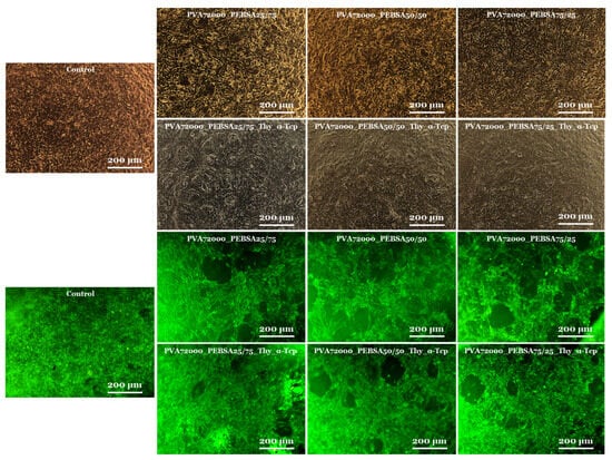 The microscopic examination of the cell culture status after 72 h (Figure 7) sustained the MTT assay data and showed that the cells had a morphology of typical fibroblasts with a homogeneous monolayer comparable in density to the control group [37]. Fluorescence microscope images from live/dead experiments indicated that the majority of fibroblasts were still alive after 72 h. BALB/3T3 fibroblasts in the sample groups showed similar fluorescence intensities compared with the control group [38], and cells reached a confluent monolayer, particularly remarkable in the PVA72000_PEBSA25/75 and PVA72000_PEBSA25/75_Thy_α-Tcp systems. Additionally, the BALB/3T3 fibroblasts [14] maintained their normal morphology (as shown in Figure 7) and displayed rapid multiplication in cell culture. The fact that the cells were able to multiply during the experiment indicates that the scaffolds are suitable for cell proliferation.