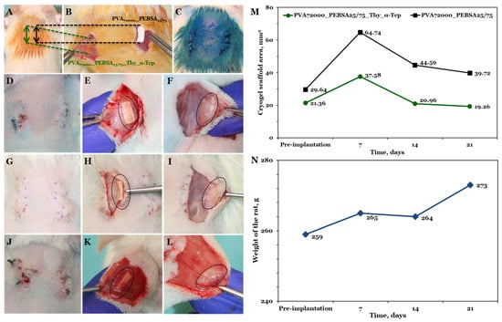 The obtained freeze–thawed scaffolds were evaluated for the in vivo wound healing assay in the full-thickness wound excision rat model. For this purpose, the PVA72000_PEBSA25/75_Thy_α-Tcp bioactive compound with superior antimicrobial activity [16] was selected as the experimental group, and the PVA72000_PEBSA25/75 system was selected as the positive control.