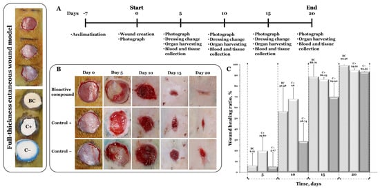 (A) Experimental design of the in vivo wound healing assay; (B) the images of in vivo wound closure studies for bioactive compound (BC), positive control (C−), and negative control (C−); (C) the wound healing ratio at days 5, 10, 15, and 20 for wound treated with bioactive compound (BC) and positive control (C−) in comparison to the negative control (C−). Graphical data are expressed as mean ± standard deviation.