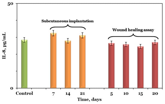 The serum inflammatory cytokine levels in both studies, namely the subcutaneous implantation and wound healing assay, at different time points, are shown in Figure 10. Cytokines are low-molecular-weight glycoproteins with an important role in many biological events, such as cellular growth, inflammation, immunity, and tissue repair. As a research hot spot, IL-8 plays a role in the immigration of neutrophils to the area of inflammation, frequently evaluated for the early detection of inflammatory lesions in the areas that are in contact with scaffold components [39].
