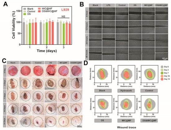 (A) Cell viability after incubation with the different hydrogel groups. (B) Cell scratch assay, to validate effects on promoting cell growth/migration. (C,D) In vivo experiments to validate the effect on wound model healing. Reproduced with permission [94].