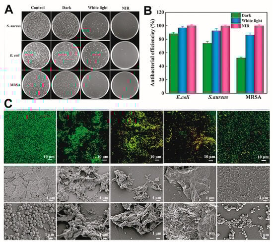 (A,B) The antibacterial activity of hydrogels against S. aureus, E. coli, and MRSA. (C) Antibacterial capacity displayed with SEM images of biofilms after different treatments. Reproduced with permission [91].