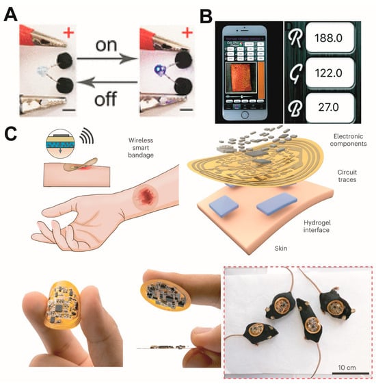 (A) Conductivity of hydrogels [124]. (B) Intelligent wound monitoring [19]. (C) Smart bandage with integrated sensors and stimulators [125]. Reproduced with permission.