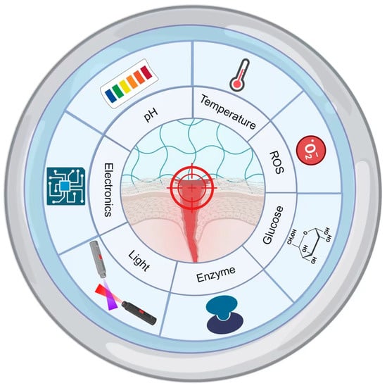 Chronic wound formation as a result of vascular injury, localised pressure, bacterial infection, and uncontrolled inflammation results in a complex wound microenvironment [13]. Traditional wound dressings such as gauze and cotton balls only cover the wound and do not address the underlying problem. Fortunately, the emergence of smart multiresponsive hydrogels in recent years has addressed this problem. Depending on pathological changes such as those in the pH, body temperature, ROS, enzymes, glucose (diabetes), and external stimuli (light, heat, electricity), various different hydrogel designs have been developed, as shown in Scheme 1.