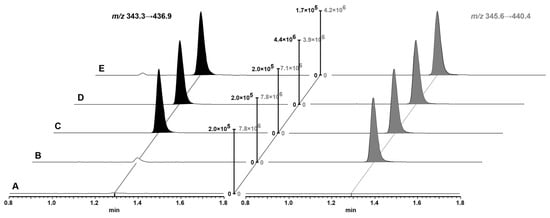 Blood samples for calibration and QC purposes were generated through the addition of 25 µL of the pertinent spike solution to 20 µL of blank blood and the subsequent addition of 25 µL of IS solution. Calibration samples were produced at 10, 30, 100, 300, 1000, 3000, and 10,000 ng/mL, and QC samples were produced at concentrations of 10, 30, 3750, and 7500 ng/mL. For study sample processing, 20 µL of each sample was added to 25 µL of IS solution, and 25 µL of ACN/H2O 1/1 + 0.1% FA was added for volume compensation to ensure that sample preparation matches that of study blood samples. For stability reasons, each sample was immediately depleted from proteins by adding 150 µL ACN including 0.1% FA. Samples were processed individually and kept frozen until processing. Subsequently, samples were centrifuged at 13,200× g for 5 min. From the extracts, 10 µL was transferred to 400 µL of ACN/H2O 1/19 + 0.1% FA in wells of a 96-well collection plate (Waters, Milford, MA, USA).
