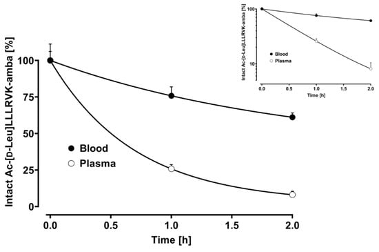 Plasma and whole-blood stability of Ac-[d-Leu]LLLRVK-amba at 1 µg/mL over 2 h at room temperature. The insert shows the corresponding semi-logarithmic presentation.