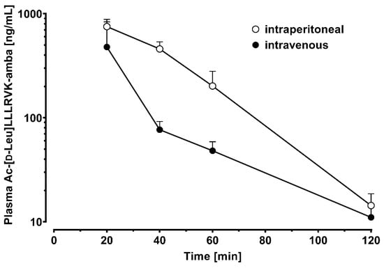 Our study has several limitations. Because we demonstrated the specificity of our assay, pre-dose samples were not collected. Due to the late first sampling in our study and the short half-life of Ac-[d-Leu]LLLRVK-amba, cmax and tmax could not be accurately determined. Further, a large fraction of the area under the concentration–time curve (AUC) (in particular for the intravenous administration) is not captured by our data. As a consequence, the AUC cannot be compared accurately, and the bioavailability of the intraperitoneal administration cannot be calculated. Nevertheless, judging by the determined partial profiles, it can be concluded that intraperitoneal absorption is very efficient.
