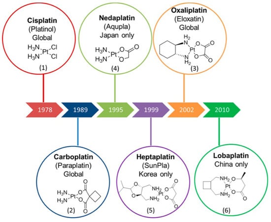 In the 1960s, the American scientist Rosenberg observed for the first time that platinum compounds could inhibit cell growth in an experiment studying the effect of electric fields on bacterial growth, thus opening the prelude to the development of this unique configuration of anti-tumor drugs. Figure 2 shows the development history of classical platinum anticancer drugs. As an important class of metal chemotherapy drugs, platinum anticancer drugs are used in more than half of chemotherapy. Currently, platinum anticancer drugs that have been approved globally for market include cisplatin, carboplatin, oxaliplatin, multi-nuclear platinum, with nedaplatin, lobaplatin, and heptaplatin approved in some countries.