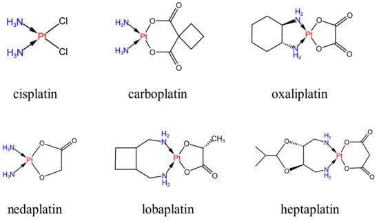 The third-generation platinum anticancer drugs also include lobaplatin and heptaplatin (as shown in Figure 3). Among these, lobaplatin, whose chemical name is 1,2-diaminomethylcyclobutane platinum(II) lactic acid (as shown in Figure 3), is a clinically representative platinum complex, successfully marketed in China in 2003. Lobaplatin is characterized by its ability to generate DNA damage through cross-linking of GG and AG chains, thereby forming DNA drug complexes that inhibit tumor activity and further affect the expression of certain specific genes in tumor cells []. Studies have shown that lobaplatin has been shown to have good therapeutic effect on some tumors in clinical practice. For example, lobaplatin has been proven to inhibit the proliferation and peritoneal metastasis of colorectal cancer in phase II clinical trials [], can also inhibit gastric cancer cells by inducing apoptosis [], can effectively inhibit human non-small cell lung cancer cells in phase S, and triggers apoptosis in human non-small cell lung cancer [,,,]. In addition, lobaplatin has shown lower drug resistance in many malignancies compared with carboplatin and has lower drug toxicity in patients []. Lobaplatin is currently registered in China for the management of metastatic disease in breast cancer and small cell lung cancer SCLC. At the same time, lobaplatin, a chemotherapy drug used in the treatment of chronic myeloid leukemia, has also been widely recognized as effective [], and some studies have suggested that lobaplatin also has an inhibitory effect on retinoblastoma []. The chemical name of heptaplatin is cis-malonic acid [(4R, 5R)-4, 5-bis-(aminomethyl)-2-isopropyl-1, 3-dioxopentyl] platinum (II) (as shown in Figure 5), which is a new generation of platinum-based anticancer drug developed by South Korea’s Sunkyo Pharmaceutical Co., LTD., in 1992. First marketed in Korea in 1999, heptaplatin’s outstanding advantage is that it still has a significant effect on cisplatin-resistant cells or tissues, while its tissue toxicity is lower. Dose-restriction toxicity can be seen in hepatotoxicity, nephrotoxicity, and myelosuppression, and is mainly used to treat advanced inoperable gastric cancer and SCLC [].