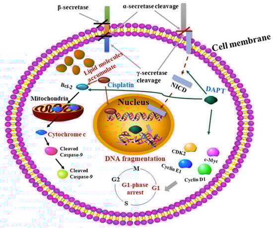 In recent years, cisplatin has often been used in combination with other drugs to treat breast cancer, so as to reduce cisplatin resistance or alleviate adverse reactions, and improve its clinical efficacy. Since natural active ingredients can significantly inhibit the recurrence and metastasis of breast cancer, reverse drug resistance, regulate the immune function of the body, reduce the toxicity of cisplatin, improve the quality of life of patients, and prolong the survival period, their application in the treatment of breast cancer is increasing [,]. For example, natural flavonoids have anti-tumor, anti-inflammatory, antioxidant, and other pharmacological activities, and are ideal drugs for tumor prevention or clinical multi-drug combination therapy. Therefore, flavonoids combined with cisplatin can improve the anti-breast cancer effect of cisplatin. A variety of natural alkaloids also have anti-tumor, antibacterial, and other biological activities, and can reduce the adverse reactions of chemotherapy drugs and improve the body’s immune function []. Polyphenols are also effective natural anti-tumor protective and therapeutic agents, which can directly kill tumor cells, and can also play a synergistic anti-breast cancer role with cisplatin by inhibiting angiogenesis, inducing cell cycle arrest, and affecting signal pathways to inhibit cell proliferation and migration []. Natural terpenoids also have strong anti-tumor activity [] and a synergistic anti-breast cancer effect when combined with cisplatin. Other natural active ingredients such as polysaccharides have also been combined with cisplatin for anti-breast cancer research []. Shenqi Fuzheng injection can down-regulate the expression of P-glycoprotein in MDA-MB-231 cells resistant to cisplatin, improve cisplatin sensitivity, reduce the release of IL-10 and PGE2 induced by cisplatin, enhance immunity, and thus exert a good synergistic anti-breast cancer effect [,]. There are many studies on the application of cisplatin in combination with other chemotherapy agents in the treatment of breast cancer, both at the cellular level and in clinical patients. The results of the studies mainly show synergistic effects and reduction or reversal of cisplatin resistance. For example, gemcitabine combined with cisplatin activates the mTOR/S6K1/NF-κB signaling pathway, up-regulates the expression of NF-κB protein and mRNA, down-regulates mTOR and S6K1 proteins, changes energy metabolism, inhibits cell proliferation, and promotes cleavage and death of breast cancer cells []. For example, one study mixed Gd-Pt therapeutic agents that incorporate platinum into micelles or other types of nanoparticles []. Xin et al. studied the efficacy of alanine-proline-arginine-proline-glycine (APRPG) peptide-coupled polyglycol cationic liposome coated with zoledronic acid (ZOL) (APRPG-PEG-ZOL-CLPS) for vascular normalization []. Cisplatin is used to improve the anticancer effect. Studies have shown that APRPG-PEG-ZOL-CLPs improves anticancer effects, which is thought to normalize blood vessels. The results showed that APRPG-PEG-ZOL-CLPs could significantly inhibit the activity, migration, and tube formation of human umbilical vein endothelial cells (HUVECs). In addition, APRPG-PEG-ZOL-CLPs decreased tumor vascular density, decreased hypoxia-inducing factor 1α(HIF-1α), and increased the expression of thrombus response protein-1 (TSP-1). Therefore, the anticancer effect of APRPG-PEG-ZOL-CLPs in combination with cisplatin is better than that of PEG-ZOL-CLP or ZOL in combination with cisplatin, and the tumor volume is significantly reduced. Therefore, the APRPG-PEG-ZOL-CLP combined cisplatin regimen is the most effective in regulating the tumor vascular system and improving the efficacy of antitumor drug therapy. Using Raman spectroscopy, Jie et al. [] studied the effects of a combination of a γ-secretase inhibitor (DAPT) and cisplatin on osteosarcoma (OS) cells (the anticancer mechanism is shown in Figure 5). The obtained spectral analysis results showed that compared with DAPT alone, the intracellular components changed significantly after combined treatment, indicating that DAPT combined with cisplatin had a synergistic effect on OS cells. Changes in subcellular morphology and biochemical distribution were observed using K-means clustering and univariate imaging. Thus, this study provides a critical understanding of the cellular response of DAPT/cisplatin combination therapy from a biochemical perspective, which provides an experimental basis for exploring therapeutic strategies of other cancer drug combinations in cancer cell systems. D. Gibson et al. [] reported on the combination of cisplatin and caffeic acid for the treatment of cancer cells. The results show that caffeic acid is a dual-acting drug that can sensitize or habituate cells to cisplatin therapy depending on the time of administration. The co-administration of caffeic acid and cisplatin was found to be effective, which provided a reasonable basis for the preparation of a new platinum caffeic acid compound.