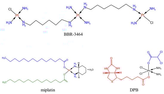 Polynuclear platinum is a new type of non-classical platinum anticancer drug; its structure is different from cisplatin and carboplatin, and its research has become a major breakthrough in platinum anticancer drugs. Farrell’s team synthesized a large amount of polynuclear platinum with alkyl diamines as bridging groups. Polynuclear platinum molecules are composed of two or more platinum atoms, which can bind to the DNA of cancer cells through non-covalent effects (electrostatic, hydrogen bonding). Compared with classical platinum complexes, they have a strong aggregation ability, so they will seriously damage the structure and function of DNA, thus making it difficult for tumor cells to self-repair. Therefore, polynuclear platinum complexes have stronger anticancer activity. Clinical studies have shown that BBR-3464 (as shown in Figure 7) has a higher degree of cross-linking than cisplatin in DNA and has strong anticancer activity without cross-resistance []. Therefore, it is used to treat some patients with advanced cancer, who often have developed resistance to some typical platinum anticancer drugs.