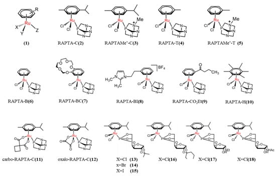 1 is the general structural formula of the semi-filled arylruthenium (II) complex; 2~12 are the chemical structures of RAPTA compounds. 13~18 are the molecular structure formula of arylruthenium (II) containing glucose molecules [].
