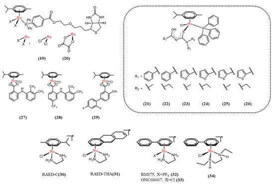 19 and 20 are arylruthenium (II) complexes of biotin-functionalized monodentate phosphorus ligands; 21~26 are monodontic acylthiourea aryl ruthenium (II) complexes; 27~29 are the arylruthenium (II) complexes of SAID class. 30~34 are structural formulas for ethylenediamine arylruthenium (II) complexes [].