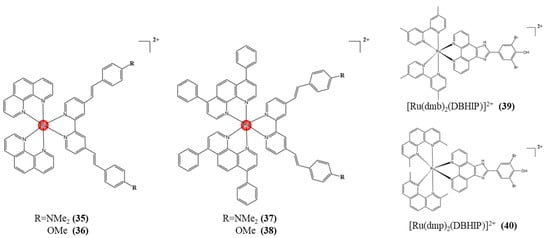 Photodynamic therapy (PDT) is a non-invasive technique used clinically to treat a wide range of cancers and bacterial, fungal, or viral diseases [,]. Among the novel PSs studied, Ru (II) polypyridinyl complexes have excellent excited state properties, high water solubility, high chemical stability, and light stability, strong luminescence, large Stokes shift, and biocompatibility, so they are widely used in PDT [,,]. Chao et al. proposed a series of novel asymmetrically substituted 1,10-phenoline and 4,7-diphenyl-1,10-phenoline Ru-II polypyridine complexes 35~38 (shown in Figure 11) as effective photosensitizers for single-light and two-photon PDT. The complex shows a redshifted single-photon absorption in the biospectral window and has a very strong two-photon absorption. They enter cells through an energy-dependent endocytosis mechanism, and after irradiation in various 2D monolayer cancer cell lines, the complex apoptoses through the caspase 3/7 pathway, resulting in cell death in the high nanomolar/low micromolar range []. Liu et al. in 2010 prepared two Ru compounds of the type [Ru(dmb)2(DBHIP)](ClO4)2 and [Ru(dmp)2(DBHIP)](ClO4)2 (Figure 11, 39 and 40) with a new ligand 2-(3,4),5-dibromo-4-hydroxyphenyl)imidazole and [4,5-F][1,10] phenanthroline (DBHIP). These complexes have excellent optical properties. They facilitate the study of the binding of DNA and ethidium bromide by emission spectroscopy. Insertion binding to DNA has also been reported. The mechanism of action involves the formation of singlet oxygen (1O2) and superoxide radical anion (O2−). These radicals are involved in DNA cleavage. These compounds have a good antioxidant capacity, are able to lyse plasmid DNA, and have a high level of cytotoxicity to tumor cell lines [].