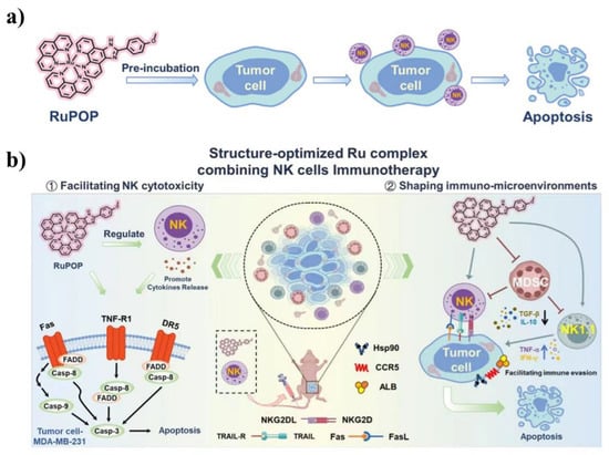 (a) RuPOP combined with hNKs to promote the killing of MDA-MB-231 tumor cells; (b) Structurally optimized RuPOP complexes promote NK cell immunotherapy for triple-negative breast cancer [].