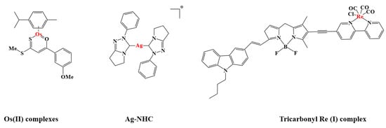 Osmium complexes have rarely been developed for their therapeutic potential due to their toxicity (OsO4) and replacement inertia (Os(II) and Os(III) complexes). Sadler et al. fine-tuned the kinetics and thermodynamics of the reaction of osmium complexes in aqueous solution by systematically changing the chelating ligands, so that the aryl osmium (II) complexes showed excellent cytotoxicity to cancer cells compared with the clinical drugs carboplatin and cisplatin []. Jana Hildebrandt et al. [] reported on various ruthenium (II) complexes and promising osmium (II) analogues, all of which use cinnamic acid as an O, S bidentate ligand. The anticancer activity and ability to evade platinum resistance mechanisms of these compounds were studied. The results showed that Ru (II) and Os (II) compounds (as shown in Figure 14) containing O and S bidentate ligands have high cytotoxicity, but their effects on DNA damage and the cell cycle are not strong. This may be the basis for bypassing drug resistance mechanisms and the high specificity of cancer cells []. Due to the similarity of the extranuclear electron configuration and chemical properties of isometal elements, in addition to the transition metals platinum, ruthenium, iridium, osmium, and other complexes described above, rhodium complexes in the same group VIII and in the same column with iridium have gradually entered researchers’ field of view. Some studies have found that some Rh (III) complexes can bind specifically to the biological macromolecules DNA and RNA []. Metal Rh (III) complexes can recognize the mismatching of guanine (G) and uracil (U) bases on RNA and the action site of a single guanine, and can be cut off under light-induced conditions for the specific recognition of mismatching bases on RNA, opening up a new road for the development of anticancer chemotherapy drugs [].