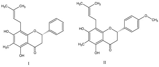 The molecular structure of flavanone I: (2S)-5,7-dihydroxy-6-methyl-8-(3-methyl-2-buten-1-il)-2-phenyl-2,3-dihydro-4H-1-Benzopyran-4-one) and flavanone II: (2S)-5,7-dihydroxy-2-(4′-methoxyphenyl)-6-methyl-8-(3-methyl-2-buten-1-yl)-2,3-dihydro-4H-1-Benzopyran-4-one.