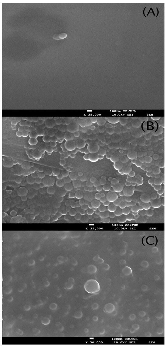 Scanning electron microscopy (SEM) was used to determine the shape and surface morphology of flavanones NPs after their preparation. One drop of each sample was deposited on a glass coverslip. After drying overnight, they were mounted on SEM holders and covered with a thin film of carbon to improve their conductivity. SEM studies were performed using a JSM-7001F (JEOL Inc., Peabody, MA, USA) on the TEM-SEM Electron Microscopy Unit from the Scientific and Technological Centers (CCiTUB), University of Barcelona. The software Image J 1.54d was used to measure the particle size from the SEM images [].