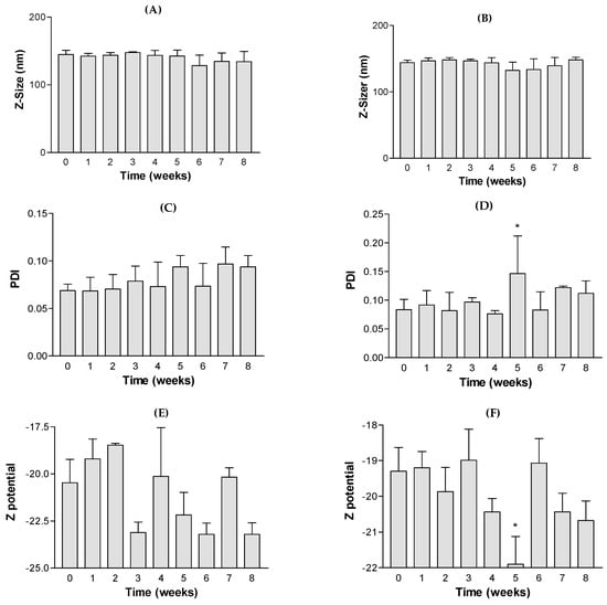Stability analysis of flavanones NP formulations: (A) NP I Z-size data; (B) NP II Z-size data (C) NP I PDI = polydispersion index; (D) NP II PDI = polydispersion index; (E) NP I zeta potential data; (F) NP II ZP = zeta potential data (Mean ± standard deviation of 3 replicates). Significant differences with 0 week, p < 0.05 (*).