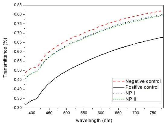 The corneal transparency changes after NP I and NP II treatment were evaluated using an adapted methodology []. Corneas of pig were exposed to 500 µL of the following compound: 0.1 N NaOH as a positive control, 0.9% NaCl (physiological saline solution) as a negative control and NP I and NP II as the experimental formulations. Every 15 min, 500 µL of 0.9% NaCl were added until a maxim of 2 h to simulate a tear clearance. Positive and negative controls, the same for both formulations, were assayed in triplicate. The transmittance of the corneas was evaluated from 400 to 800 nm.