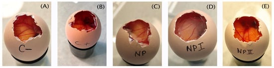 The effect of the studied formulations was evaluated using the HET-CAM method. (A) C−: negative control, saline solution, (B) C+: positive control, 0.1 N sodium hydroxide solution, (C) NP: nanoparticle with only excipients = nNP, (D) NP I: PLGA nanoparticle encapsulated flavanone I (E) NP II: PLGA nanoparticle encapsulated flavanone II.