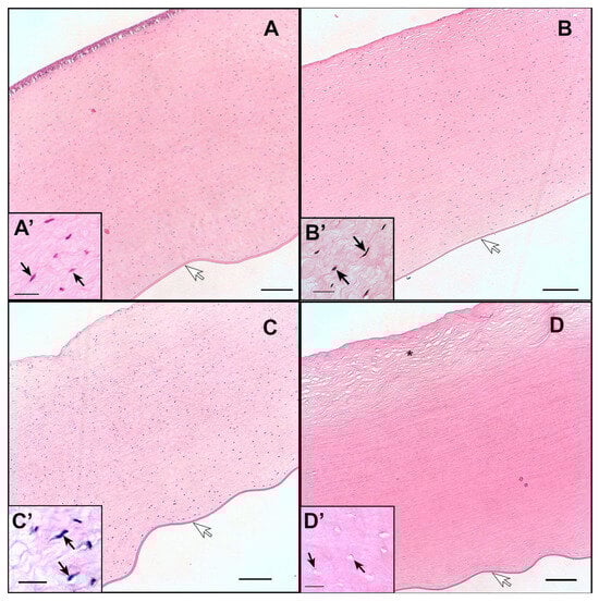 The cornea samples were observed with fibrous cells, the keratocytes (Figure 8). In the positive control sample (Figure 8D’, marked with the black arrow) the lack of keratocytes (or that they are very deformed) was observed. While the samples (NP I, NP II and negative control—Figure 8A’–C’ marked with the black arrow) contained keratocytes and cell nuclei can be observed. The surface below the outer epithelium in the positive control image is the area that seems most unstructured compared to the other samples (Figure 8D’, marked with asterisk).