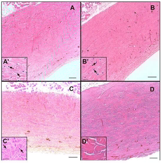 Representative histological sections of sclera: (A) treated with NP I; (B) treated with NP II; (C) negative control conditions treated with physiological saline solution; (D) positive control condition treated with 0.1 N NaOH. A’–D’ = zoom sections of (A–D). Scale bar (A–D) = 200 μm and scale bar (A’–D’) = 25 μm. Black arrows indicate cell nuclei, which is present in almost all the figures except in the positive control.
