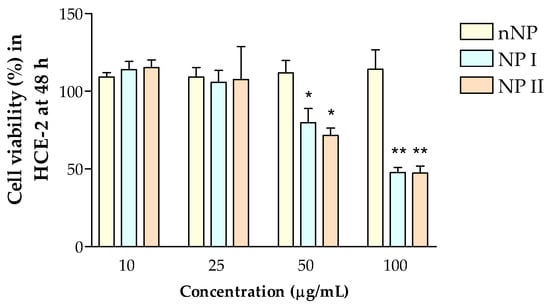 Cell viability of HCE-2 cells treated with the different formulations (nNP, NP I, NP II) at 48 h. Cell viability was assessed by the MTT assay and expressed as percentage of the viability of untreated control cells, assigned as 100%. Data are expressed as mean ± SD from three independent experiments. * p < 0.05 and ** p < 0.001.