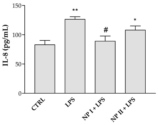 To evaluate the anti-inflammatory activity of the NP I and NP II, the LPS (lipopolysaccharide) inflammation model was used. To this end, HCE-2 cells were seeded at a density of 1 × 105 cells/mL in 12-well plates and cultured until 90% confluence. Then, the cells were incubated with the NPs (nNP, NP I, NP II; 25 µg/mL) for 24 h, before the addition of LPS (10 µg/mL). After 24 h treatment, the culture supernatants were collected, centrifuged at 16,000× g for 20 min at 4 °C, and stored at −80 °C until use. Cells which had not undergone LPS treatment were processed as a negative control (CTRL). Secreted levels of the pro-inflammatory cytokine IL-8 were quantified by ELISA (enzyme-linked immunosorbent assay) (BD Biosciences, San Diego, CA, USA), in accordance with the manufacturer’s instructions. The results were expressed as pg/mL.