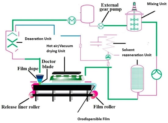 Schematic diagram displaying the typical solvent casting processes involved in orodispersible film manufacture (adapted from [4], published by MDPI, 2021).