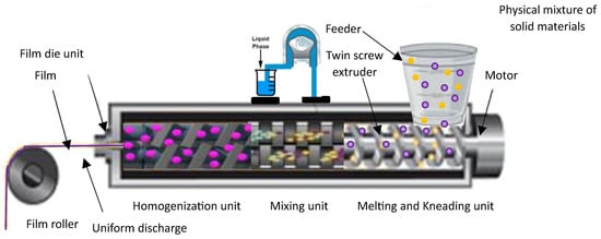 HME technology is a solvent-free, single-step continuous manufacturing process commonly employed to improve the water solubility of hydrophobic drugs through the formation of solid dispersions comprising both drugs and carrier materials (Figure 3). HME offers a promising and practical alternative to solvent casting, as it minimizes solvent usage and addresses issues associated with mixing and drying processes. An innovative approach combining the HME technique and solvent casting method has been utilized to develop ODFs incorporating micropellets, enabling extended drug release [107]. Manufacturing of a non-sticky, transparent, and uniform film using a hot-melt extrude equipped with a standard screw configuration has been described. The polymer matrix used for the melt extrusion process was comprised of modified starch with glycerol in addition to sweetening and saliva-simulating agents. The film formulations demonstrated fast disintegration (6 to 11 s) and demonstrated over 95% dissolution within 5 min [27]. In a recent investigation, HME was employed to achieve the continuous production of ODFs containing a substantial dosage of nimesulide, classified as a BCS II compound [114]. A mechanically robust film was successfully formulated, exhibiting an exceptional drug-loading percentage of up to 21.73% w/w and showcasing an optimal drug-release profile, further highlighting its effectiveness. The use of HME technology effectively improved the taste and enhanced the aqueous solubility of the drug in the development of mefenamic acid-loaded ODTs. This approach has the potential to be applied to the development of ODFs embedded with taste masking of bitter APIs, especially those belonging to BCS class II and class IV drugs [115].