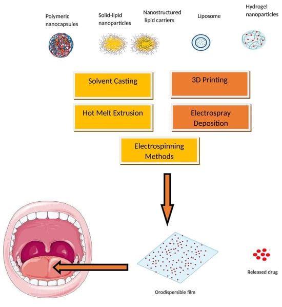 The advantages of embedding either polymeric or lipid nanoparticles into ODFs are multifaceted, including enhanced drug solubility and permeability, controlled release, targeted drug delivery, taste masking, and improved stability during storage and transportation [130,131,132]. Embedding nanoparticles into ODFs usually requires specialized formulation methods like solvent casting, HME, and spray drying. These techniques offer the necessary control and compatibility for successfully embedding nanoparticles in ODFs while addressing the challenges associated with their integration into the film formulation. A schematic diagram depicting the typical nanoparticle types and methods employed for incorporating nanoparticles into ODFs is presented in Figure 6. These techniques are employed to achieve the even dispersion of nanoparticles while preserving the film’s mechanical characteristics and overall integrity. Despite the promising potential of nanoparticle-loaded ODFs, there are challenges to address, including concerns about nanoparticle toxicity, regulatory compliance, and quality control. It is essential to thoroughly evaluate these aspects to ensure the safety and efficacy of such formulations. Several studies have suggested that formulating APIs in lipid nanoparticles can enhance their oral bioavailability [133,134]. Additionally, lipid formulations have been shown to mitigate the impact of food on API absorption [135]. The main approach to improving the bioavailability of APIs in lipid dispersions revolves primarily around creating surface-active monoglycerides. These monoglycerides, in combination with bile salts, give rise to mixed micelles that can encapsulate drug molecules. These mixed micelles are believed to facilitate the direct absorption of the API in conjunction with the lipids.