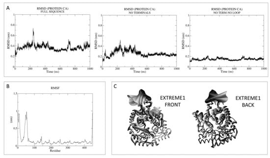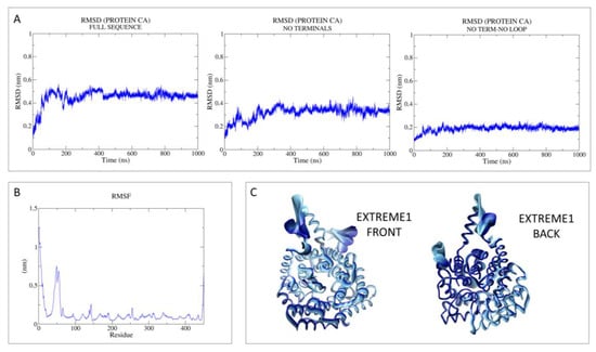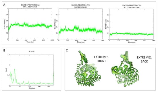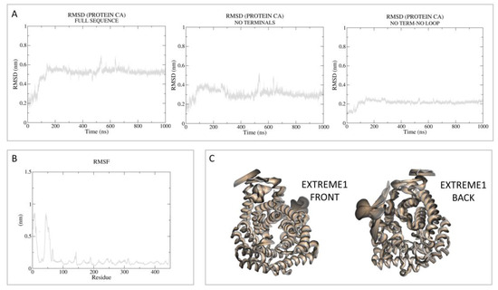 The two selected models were submitted to the 1 µs MD, and the corresponding trajectories were analyzed as follows to verify the simulation stability and gain information on the flexibility in the absence of the ligand. The complete analyses of root mean square deviation (RMSD) are reported in Figures S3 and S4, revealing especially that the RMSD contributions are mainly borne by the terminals and the loop regions, which are very flexible.