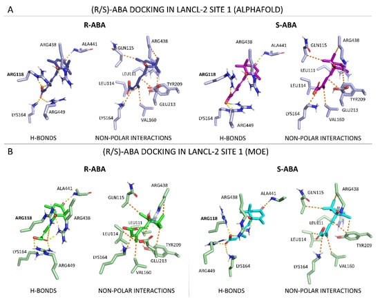 Based on the resulting molecular docking outcomes of R/S-ABA in LANCL2 Site 1, both R- and S-ABA shared a comparable positioning and pattern of interaction with the biological target, referring to both the two protein models (MODEL1–2). As shown in Figure 4, the two ABA enantiomers mainly displayed H-bonds with ARG118, LYS164, ALA441 (backbone), ARG438, and ARG449.