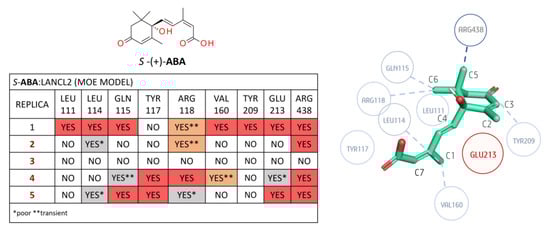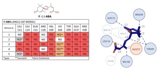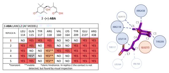 Concerning the non-polar contacts analysis of the S-ABA:LANCL2 system (AF model), only the interactions with residues ARG438, ARG118, and GLU213 are observed in the five replicas (see Figure 8), whereas, at variance with the R-ABA:LANCL2 simulations, the contacts with TYR117, VAL160, and LYS164 were almost completely lost.
