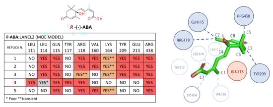 The most relevant H-bonds involving the R-ABA:LANCL2 system are established with ALA441, ARG438, and ARG118. Such interactions were replaced by H-bonds with TYR209 and ARG449 in replica 4, which exhibits ligand destabilization. H-bonds with LYS164 exhibits a transient character in all the simulated complexes.