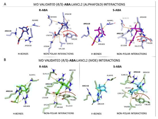 According to this information, the R-ABA:LANCL2 system (AF model) featured stable H-bonds between ABA and ALA441, ARG438, and ARG118, and most of them were also retained in the S-ABA:LANCL2 system (AF-model). Indeed, the S-ABA:LANCL2 system (AF model) experienced a lower number of conserved interactions when compared to R-ABA. Only the H-bond with ALA441 and ARG118 were conserved in four/five replicas (replica 1 exhibited a certain destabilization). Other H-bonds, however, replaced the disrupted ones, and ligand binding is maintained in all of the cases. In particular, for replica 1, ABA cyclohexyl ring exhibits a kinked conformation, which disrupts the H-bond with ALA441. However, the ABA carbonyl establishes a very stable H-bond with TYR209 that still stabilizes the complex.
