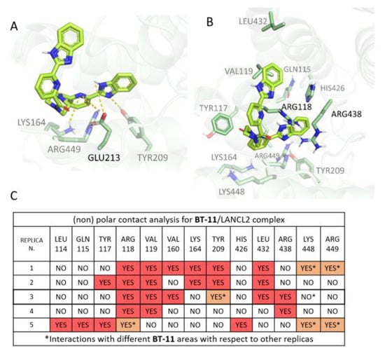 Afterwards, 1 μs MDs of the mentioned systems were carried out to in silico validate the mode of interaction of the LANCL2 agonist with the target, leading to a comparable ABA binding mode. Then, another known LANCL2 activator was considered (BT-11) via molecular docking and MD simulations. In particular, we speculated that this synthetic activator may bind at the same binding site as ABA to exert LANCL2 activation. We therefore applied a three-step (standard precision—SP, extra precision—XP, and induced fit—IF) docking protocol to BT-11 (see Table S5), and then we selected three poses for MD validation (see Section 2).
