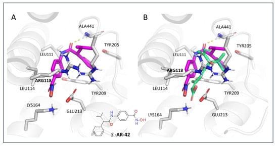 Here, we developed for the first time a long molecular dynamic (MD) simulation of the complete hLANCL2 model as derived by the aforementioned new PDB code 6WQ1. Then, we exploited this structural information to elucidate the binding pose of (R/S)-ABA in its high affinity binding site (Site 1) via molecular docking, followed by long MDs. The derived complexes were simulated for 1 μs by means of all-atom molecular dynamics (MDs), producing five replicas for each system. Similarly, the known drug-like LANCL2 agonist BT-11 was also investigated in silico via the previously cited PDB code 6WQ1, to clarify the most relevant LANCL2 agonist interaction pattern. The results obtained allowed us to point out the main features supporting the compounds’ ability to target LANCL2 and to proceed with the subsequent evaluation of a novel promising LANCL2 agonist (AR-42) (see Figure 1). This compound has been previously reported as a histone deacetylase (HDAC) inhibitor for cancer treatment [].