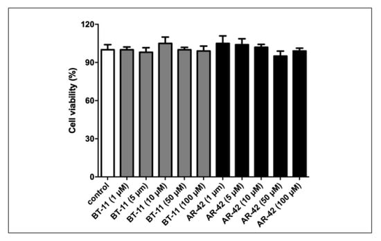 H9c2 cells were seeded into 96-well plates at a density of 5 × 103 cells/well and cultured for 24 h. Then, cells were incubated with 1, 5, 10, 50, and 100 µM BT-11 and AR-42, respectively (100 μL/well). After 24 h of incubation, cell vitality was assessed by resazurin (7-Hydroxy-3H-phenoxazin-3-one 10-oxide) assay [], adding, at 15 μL/well, a 0.015% solution of resazurin in PBS and incubating for 4 h. The percentage of viable cells was determined measuring fluorescence with filter set Ex544/Em590 in a microplate reader (CLARIOstarPlus BMG Labtech, Ortenberg, Germany).