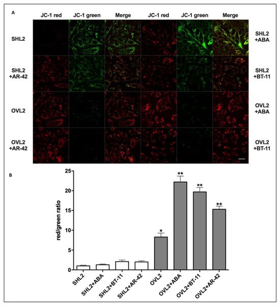 OVL2 and SHL2 H9c2 cardiomyocytes were stained with the cationic dye JC-1 (ThermoFisher Scientific, Waltham, MA, USA), which exhibits potential-dependent accumulation in mitochondria. At low membrane potentials, JC-1 exists as a monomer and produces a green fluorescence (emission at 527 nm), whereas, at high membrane potentials, JC-1 forms aggregates and produces a red fluorescence (emission at 590 nm). Thus, mitochondrial depolarization is indicated by a decrease in the red/green fluorescence intensity ratio []. Cells were treated with the same method already described in []. Briefly, H9c2 cells were seeded at 2 × 104 onto µ-slide wells, treated or not with 10 µM ABA, BT-11, and AR-42 for 2 h, stained with JC-1 (2.5 µg/mL) for 20 min at 37 °C in a 5% CO2 incubator, and then imaged live. The red/green ratio was analyzed after a background subtraction with the ImageJ v1.8.0 software [] using a quantitative analysis based on an intensity measurement of specific selected ROIs.