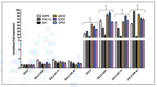 We analyzed the gene transcription levels of AMPK, PGC-1α, and Sirt1 (regulators of mitochondrial biogenesis and function), of eNOS (responsible for the production of cardioprotective NO), and of two ROS-scavenging enzymes, superoxide dismutase (SOD2) and glutathione peroxidase (GPX4) on LANCL2-overexpressing and LANCL2-silenced H9c2 cardiomyocytes treated or not with ABA, BT-11, and AR-42. The results show that LANCL2 overexpression highly stimulated AMPK, PGC-1α, Sirt1, and eNOS, as already observed before []; in addition, we observed a higher transcription of SOD2 and GPX genes in overexpressing compared to silenced cells, and treatment with ABA, BT-11, or AR-42 further increased the mRNA levels of these genes (Figure 16).