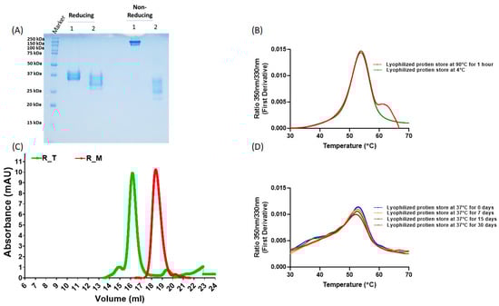 Biophysical characterization of RBD. (A) 12% SDS PAGE with (1) R_T and (2) R_M under reducing and non-reducing conditions. (B) Lyophilized R_T was subjected to 90 °C incubation for 1 h and, following solubilization, nDSF-data were acquired. Similar data for R_M have been reported previously [10] (C) Size-exclusion chromatography profiles for monomeric RBD (R_M) and trimeric RBD (R_T) with predominant peaks at 16.78 mL and 14.01 mL, respectively, on an S200 10/300GL column calibrated with Biorad gel filtration marker (Hercules, CA, USA, Cat. No. 1511901), run at a flow rate of 0.5 mL/min with PBS (pH 7.4) as mobile phase. (D) Equilibrium thermal unfolding measured using nanoDSF for lyophilized R_T, subjected to 37 °C incubation for 4 weeks, and then solubilized prior to nDSF.