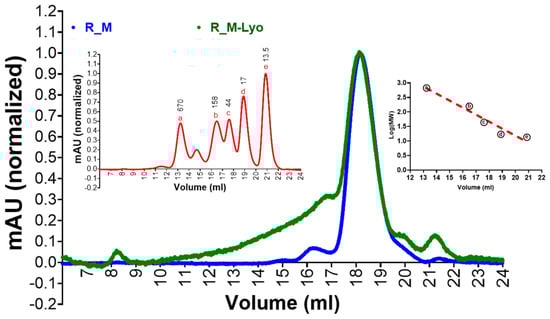 Effect of lyophilization and extended thermal stress on oligomerization status and antigenicity of R_M. Protein in PBS buffer was lyophilized, incubated at 37 °C for 4 weeks and then redissolved in an identical volume of water prior to the experiments. The control sample was stored in PBS at −80 °C and thawed prior to use. Protein samples were subjected to SEC on a Superose 6 10/300 GL prepacked column (Cytiva). Peak maxima normalized plot for proteins is shown in the main panel. SEC profile of Gel Filtration Standard (BioRAD, Hercules, CA, USA, Cat #1511901) is shown in the left inset, whereas a–e corresponds to molecular weights of standards shown in left inset and marked as kDa values (670, 158, 44, 17 and 13.5 respectively while Log MW vs elution volume plot is shown in the right inset. The elution volume for R_M = 18.1632 mL and R_M-Lyo = 18.16952. The corresponding protein molecular weight of R_M = 42.277 kDa and R_M-Lyo = 42.141 kDa.
