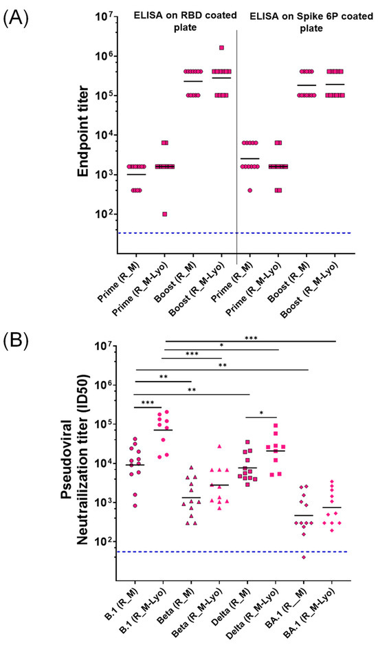 Lyophilized R_M retains immunogenicity after one month-long incubation at 37 °C. ELISA titers elicited by R_M and R_M-Lyo prime and Boost sera on SARS COV-2 RBD and Spike-6P immobilized (4 µg/mL) ELISA plates (A). Boost sera were tested for neutralization against SARS CoV-2 B.1 (WT), Beta, Delta, and BA.1 (Omicron) pseudoviruses. Lyophilized and thermally stressed protein elicits sera with superior immunogenicity, compared to the freshly formulated control protein (B). Statistical significance was determined on log-transformed data by one-way ANOVA with Dunnett’s multiple comparison (* p ≤ 0.05; ** p ≤ 0.01; *** p ≤ 0.001).