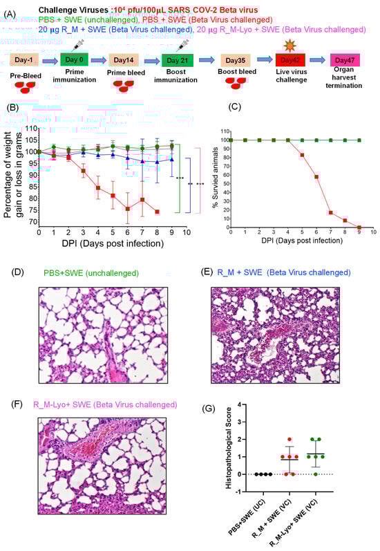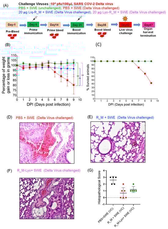 Lyophilized R_M retains protective efficacy against heterologous Beta virus challenge in transgenic mice expressing human ACE2 (hACE-2 mice), after one month-long incubation at 37 °C. (A) hACE-2 expressing transgenic mice were immunized twice with 20 µg of SWE adjuvanted R_M control or R_M-Lyo protein. The control protein was stored frozen at −80 °C and thawed on ice prior to formulation with SWE. The lyophilized protein was incubated at 37 °C for one month, reconstituted in water at 1 mg/mL, and then formulated with SWE. Three weeks after the second immunization, mice were subjected to intranasal challenge with 104 pfu of live SARS-CoV-2 Beta variant. (B,C) Average body weight changes and % survival at nine days post-virus challenge. For statistical comparison, the mean of two independent groups were analyzed using Unpaired t-test (** p ≤ 0.01; *** p ≤ 0.001) with GraphPad Prism 9.4.0. Each condition [green (unchallenged), blue (R_M + SWE Beta Virus challenged) and pink (R_M-Lyo + SWE Beta Virus challenged) were independently compared with PBS+SWE (Beta virus challenge, red color). (D–F) Lung histopathology images at 10× magnification are shown for all cases except the unimmunized Beta virus challenge group. None of the unvaccinated challenged animals survived beyond 8 days. (G) Histopathological score.